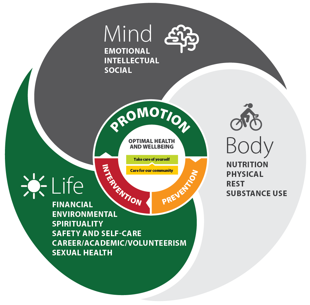 We recognize the wholeness of a person's health is comprised of interdependent elements: mind, body and life. Therefore, the wellness strategy takes a holistic approach to being well in supporting three elements of wellness: